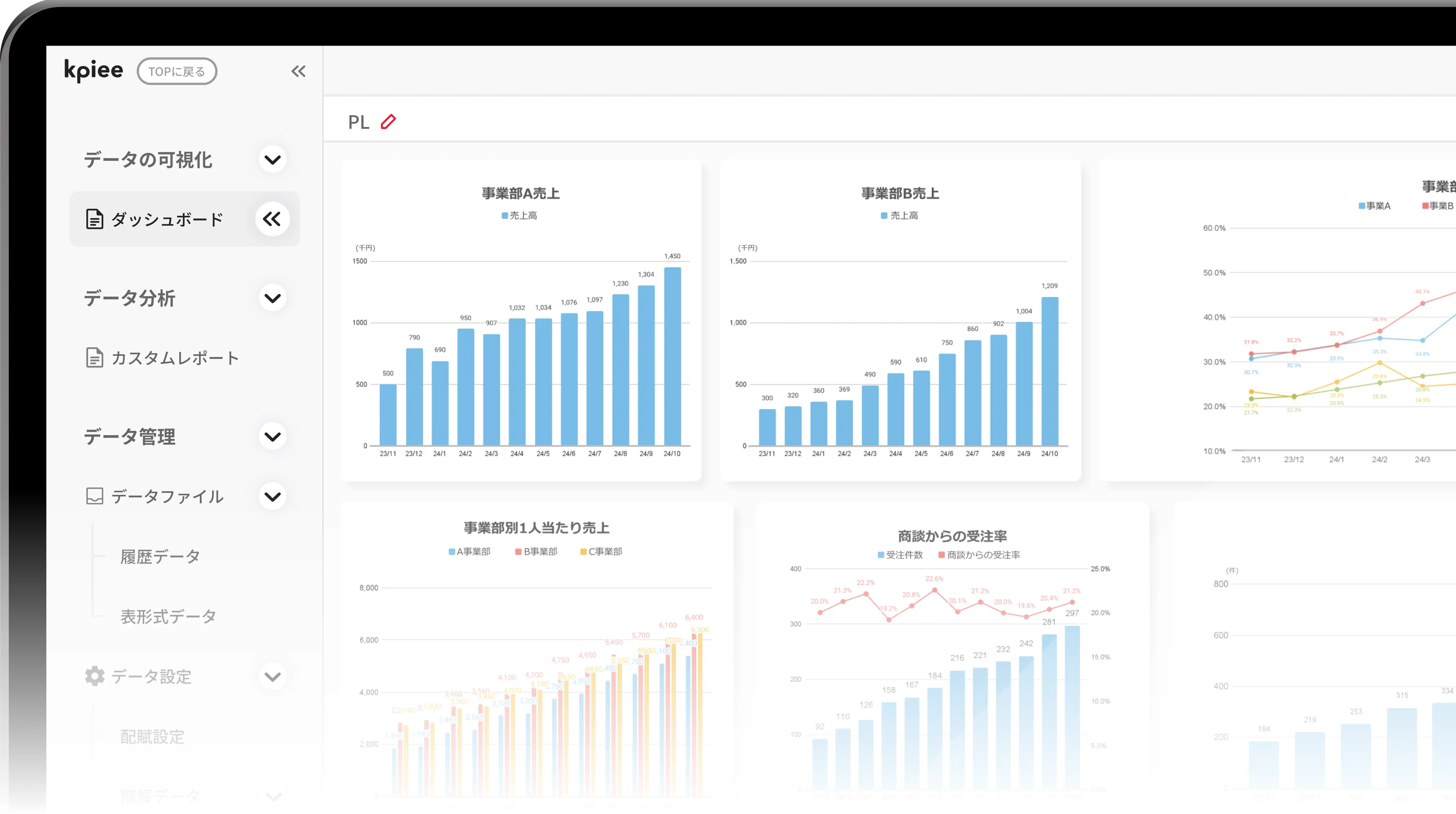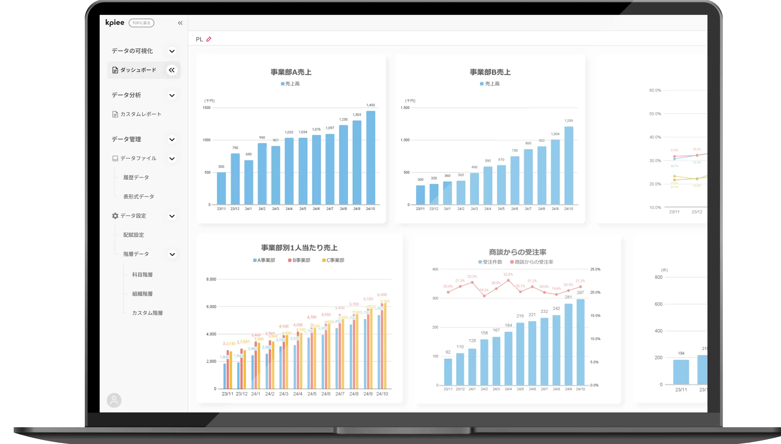 全社状況をまとめたサマリレポートから事業別や部署別の売上推移グラフまで、