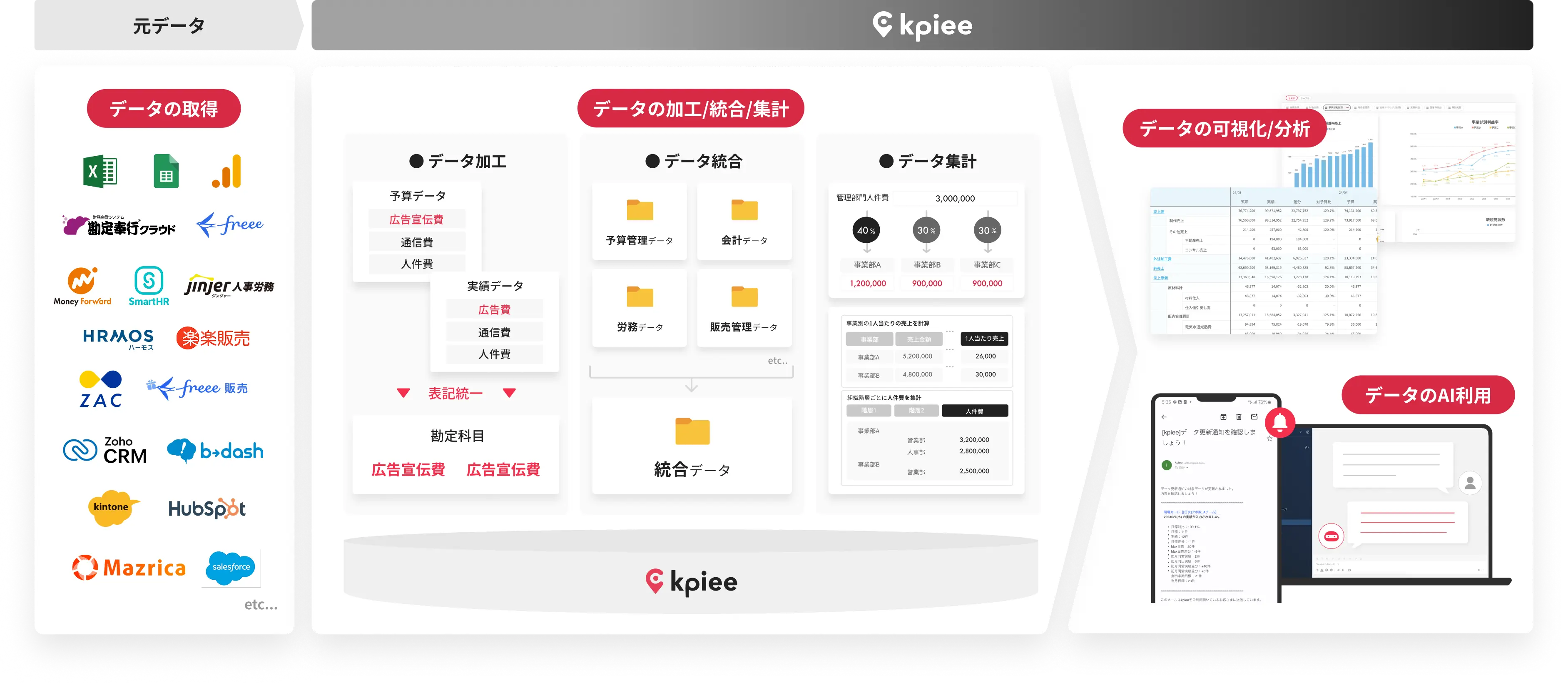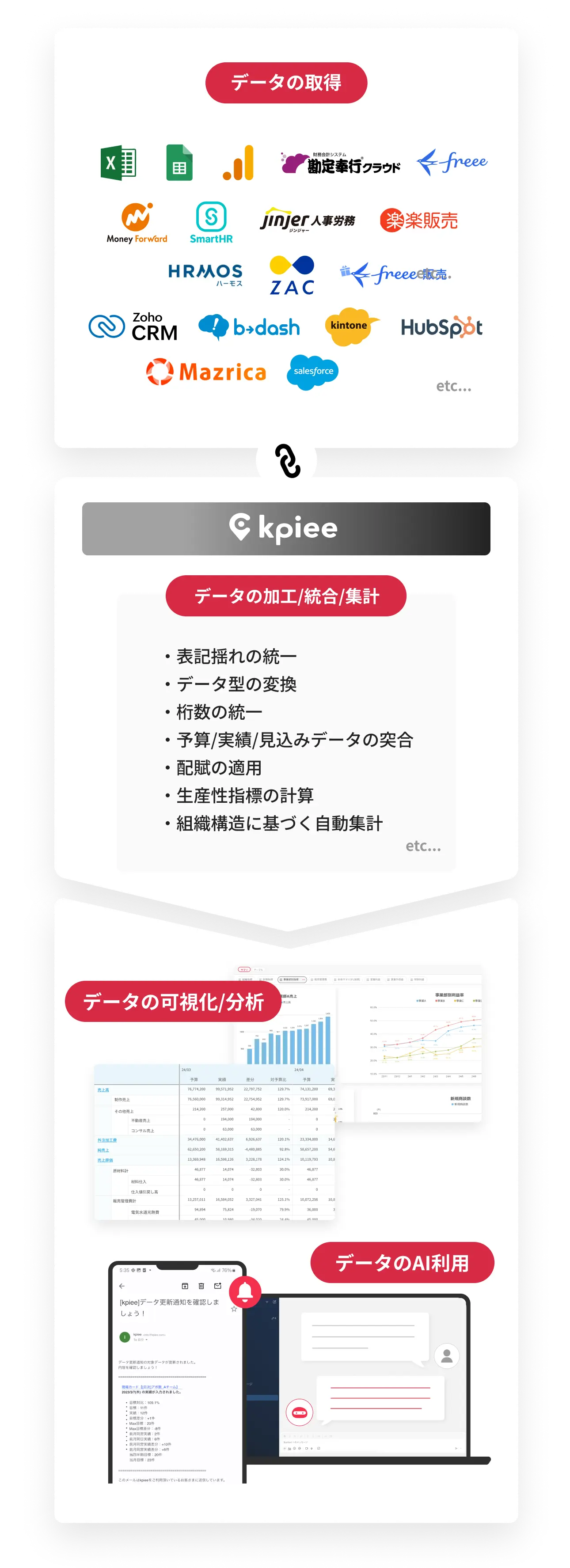 PLなどの会計データと、人時生産性といった事業KPIなど、
