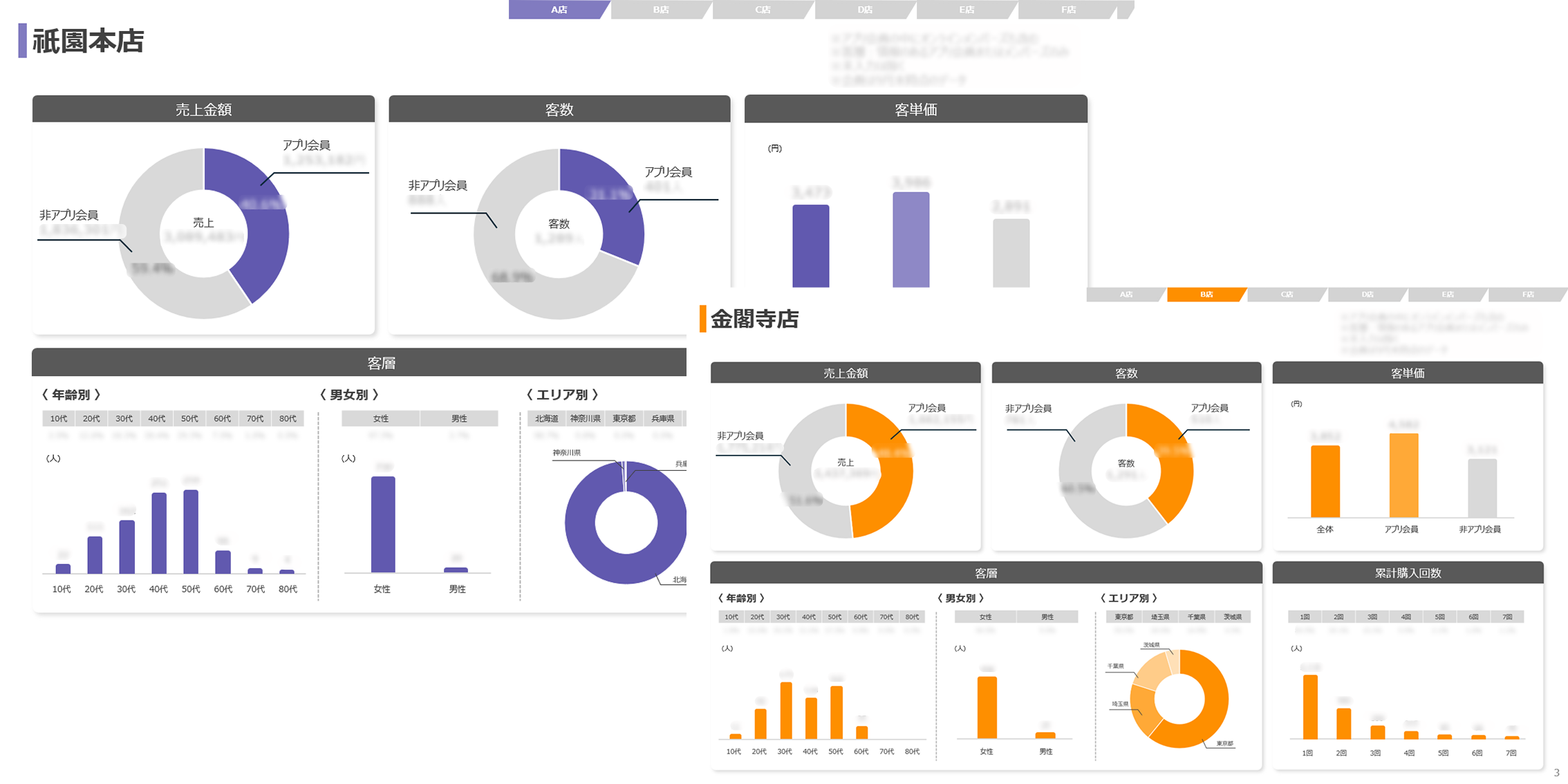 ‐店舗別に「売上」「客数」「客単価」「客層(年齢/性別/エリア)」「累計購入回数」を可視化。